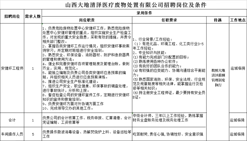 为适应山西大地清泽医疗废物处置有限公司(以下简称:“大地清泽公司”)全方位高质量发展的需要,根据实际工作需求,现面向社会公开招聘工作人员7名(安健环工程师1名,会计1名,车间操作技术人员5名),现就有关事项公告如下: