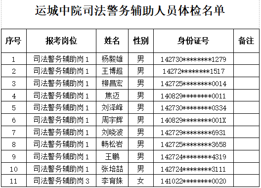 根据《运城市中级人民法院2022年司法警务辅助人员招聘公告》相关要求,经过网上报名、资格审查、笔试、体测、面试等环节,现就成绩查询及体检有关事项通知如下: