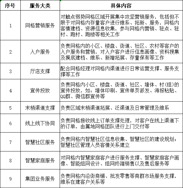 网格“服务工程师”。配合区县、网格进行区域范围内网格营销、家庭业务拓展、入户服务、厅店支撑、宣传投放、末梢拓展、客情关系建立、沿街商铺拓展及营销等。