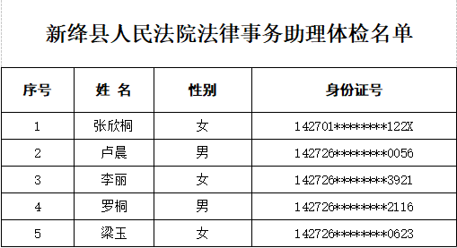根据《新绛县人民法院2022年法律事务助理招聘公告》相关要求,经过网上报名、资格审查、初试、面试等环节,现就面试成绩查询及体检有关事项通知如下: