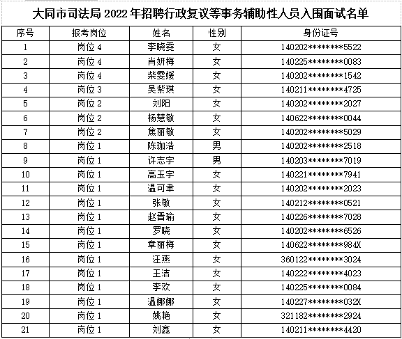根据大同市司法局2022年招聘行政复议等事务辅助性人员的相关要求,经过线上报名、资格审查、笔试等环节,现就面试有关事项通知如下: