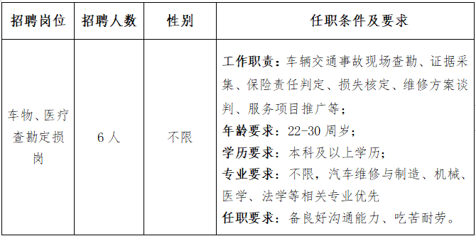 根据工作需要,山西英国上市公司365人力资源派遣有限公司(以下简称:英国上市公司365人力资源公司)受平安财险运城中心支公司委托,面向社会公开招聘车物、医疗查勘定损岗6人,现将有关事项公告如下:
