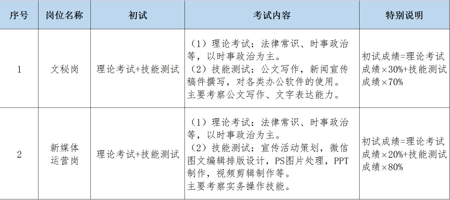 初试分为理论考试与技能测试,各项满分均为100分。各岗位考试内容及初试成绩占比如下: