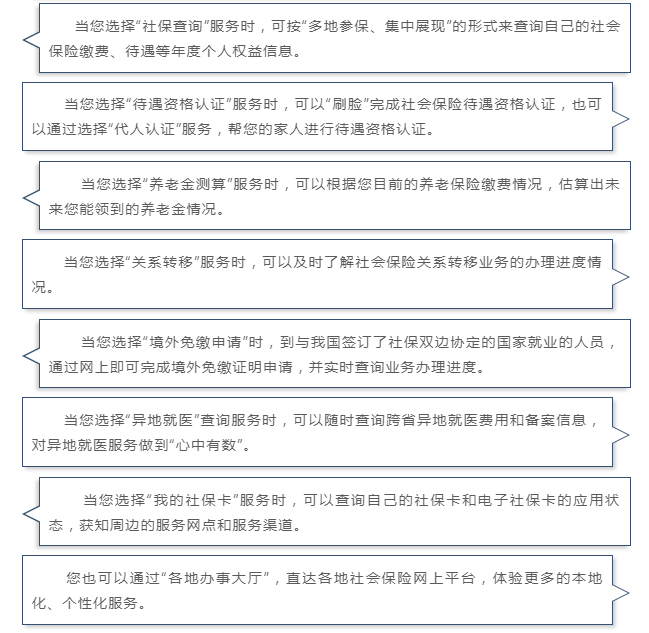 党的十九大提出“建立全国统一的社会保险公共服务平台”,人力资源社会保障部按照“一号申请、一窗受理、一网通办、一卡通用”的公共服务模式开展了组织建设。国家社会保险公共服务平台是全国统一的社会保险公共服务的总门户,重点为参保人和参保单位提供全国性、跨地区的社会保险公共服务,首期开通8类18项全国性统一服务。您可以访问国家社会保险公共服务平台门户(si.12333.gov.cn)或下载“掌上12333”手机APP,通过用户注册登录后体验相关服务。已申领了电子社保卡的人员,可打开电子社保卡“扫一扫”功能,快速扫码登录,并可以直接在电子社保卡页面查询办理相关社保服务。