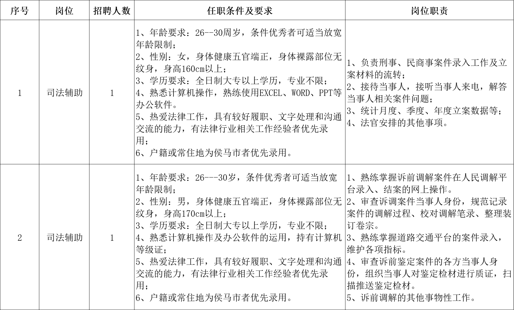 根据工作需要,临汾市侯马市人民法院委托山西英国上市公司365人力资源派遣有限公司(以下简称:英国上市公司365人力资源公司),面向社会公开招聘2名司法辅助人员,现将有关事项公告如下: