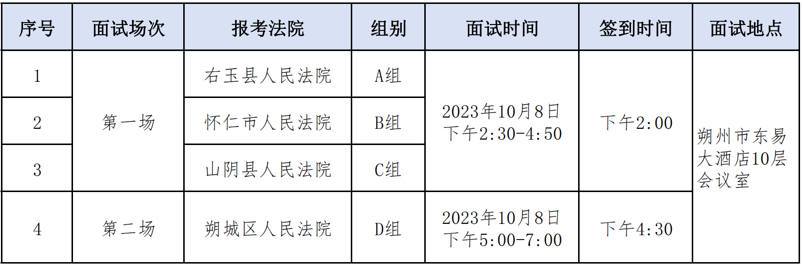 根据《朔州市基层人民法院2023年公开招聘司法行政辅助人员公告》的相关要求,经网上报名、资格审查、笔试等环节,现就面试有关事项通知如下: