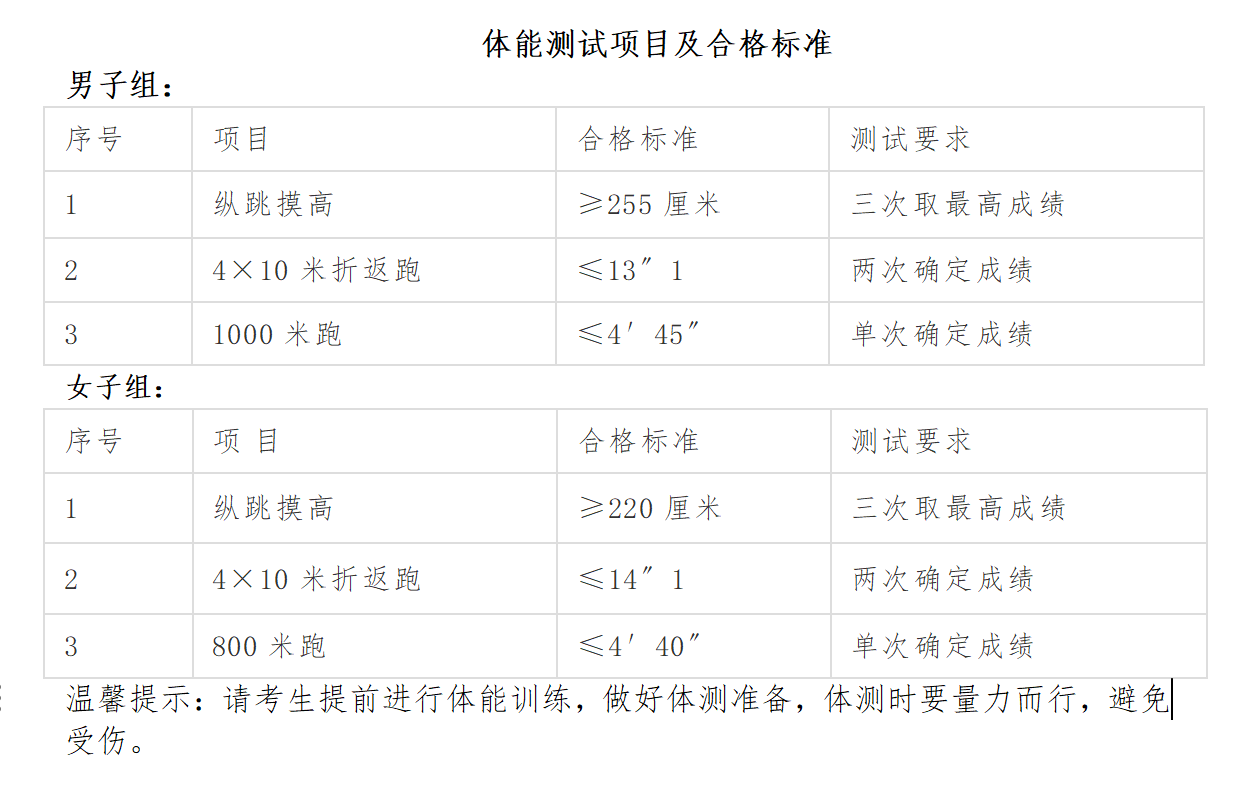 2.体能测试(警务辅助):按照笔试成绩由高到底的顺序,根据各岗位招聘人数1:5的比例确定体能测试人员名单,不足1:5比例的,全部进入体能测试环节。体能测试为达标性测试,凡其中一项不达标的,视为体能测试不合格;体能测试成绩不计入报考人员综合成绩。