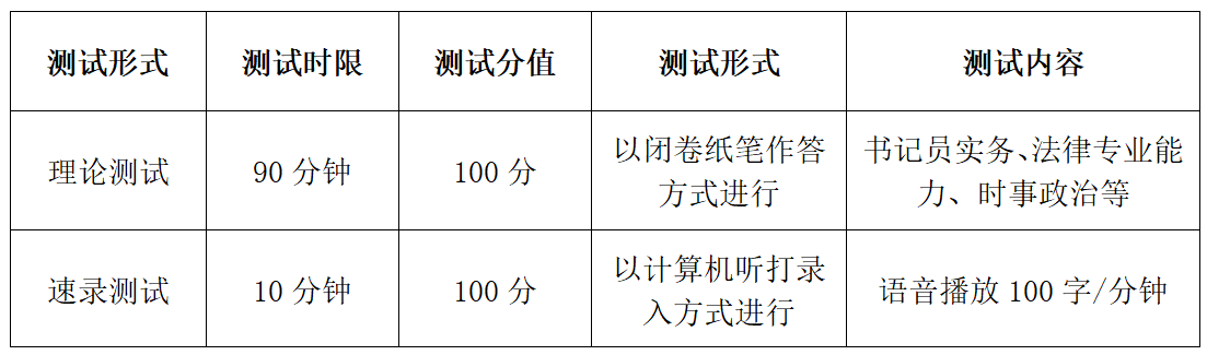 1.专业能力测试成绩计算办法:理论测试成绩×60%+速录测试成绩×40%(成绩采取百分制,理论测试成绩、速录测试成绩、专业能力测试成绩均保留两位小数,尾数四舍五入)。其中,速录技能测试成绩60分以上为合格,不合格者取消面试资格。