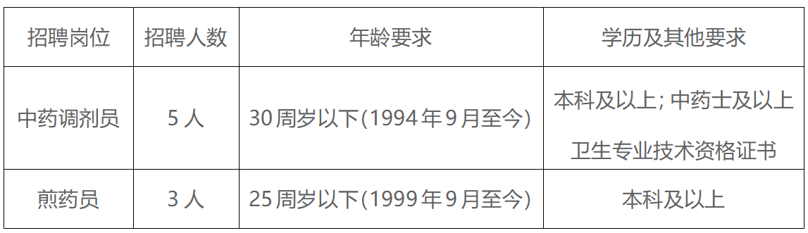 2.中药调剂员岗位年龄要求在30周岁以下(1994年9月至今);煎药员岗位年龄要求在25周岁以下(1999年9月至今);