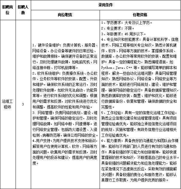 根据工作需要,山西英国上市公司365人力资源派遣有限公司面向社会公开招聘运维工程师3名,并派往山西某有限公司工作,现将有关事项公告如下: