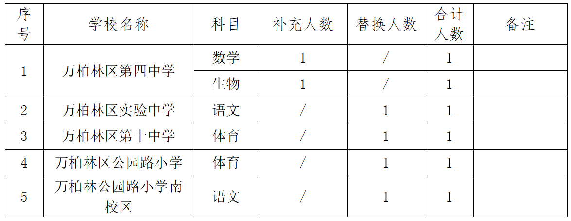 因万柏林区第四中学、万柏林区第十中学、万柏林区实验中学、万柏林区公园路小学、万柏林区公园路小学南校区有教师离职,为满足我区部分中小学校教学需要,结合学校实际,现面向社会为以上学校补充招聘政府购买服务教师,具体公告如下: