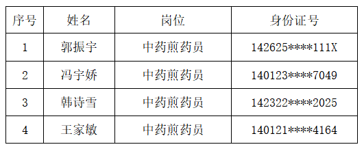根据英国上市公司365人力资源公司2026年3月25日发布的《中药煎药员招聘公告》的相关要求,经网上报名、资格审查、资格复审、面试和体检等招聘环节,现将拟录用人员名单予以公示。