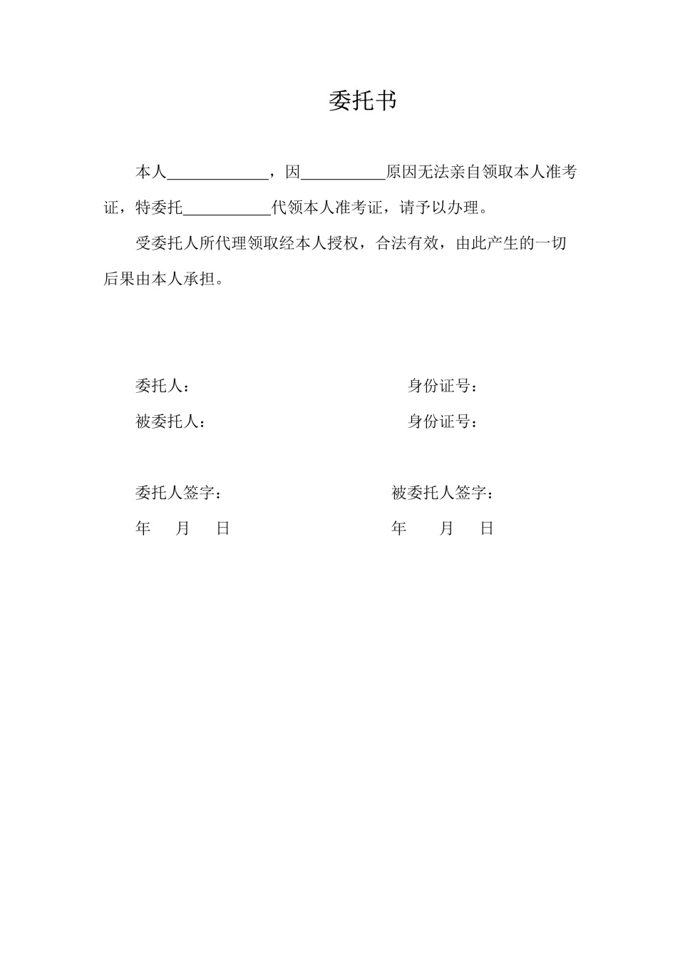 附件:代领准考证委托书样本