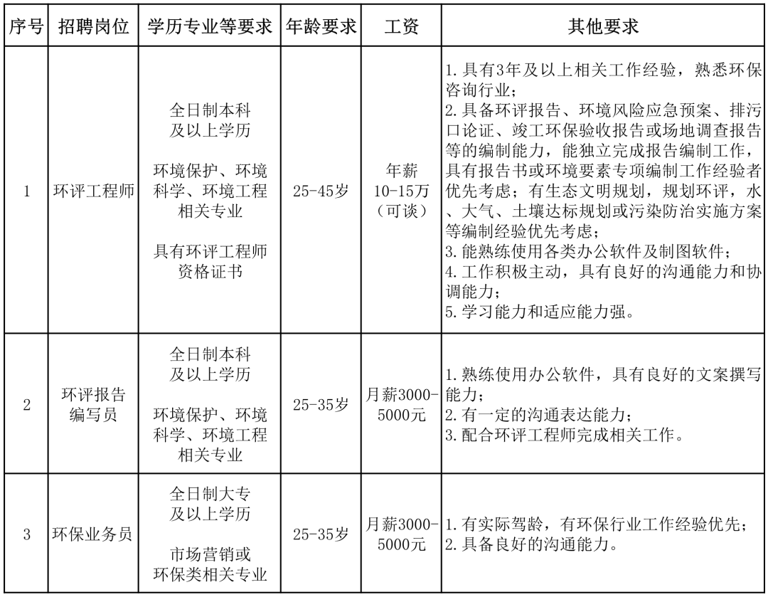 1、环评工程师1名;