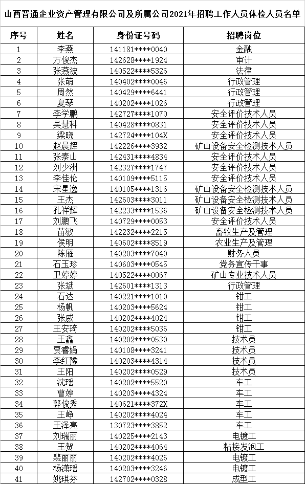 根据《山西晋通企业资产管理有限公司及所属公司2021年招聘工作人员公告》要求,经网上报名、资格审查、笔试、面试等环节,现将面试成绩查询、体检等有关事项通知如下: