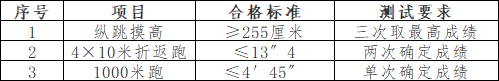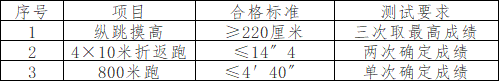 根据各岗位人员笔试成绩从高到低的顺序,按各岗位计划招聘人数1:5的比例确定参加体能测评人员名单。体能测评为达标性测评,凡其中一项不达标的,视为体能测评不合格。体能测评成绩在测评点当天公布,不计入报考人员综合成绩。体能测评测试项目及合格标准如下:
