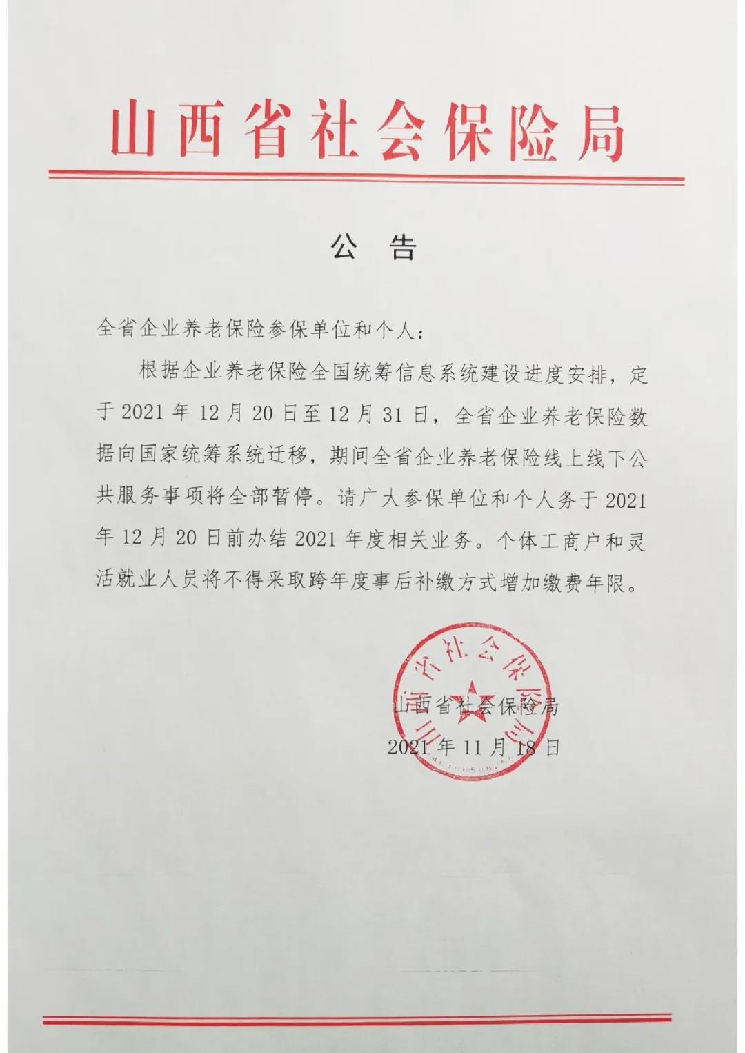 根据企业养老保险全国统筹信息系统建设进度安排,全省定于2021年12月20日至12月31日向国家统筹系统迁移企业养老保险数据,期间企业养老保险省集中系统将停止服务,全省企业养老保险公共服务事项全部暂停。2022 年1月1日起将使用企业养老保险全国统筹信息系统经办业务。