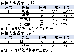 一、入围体检名单