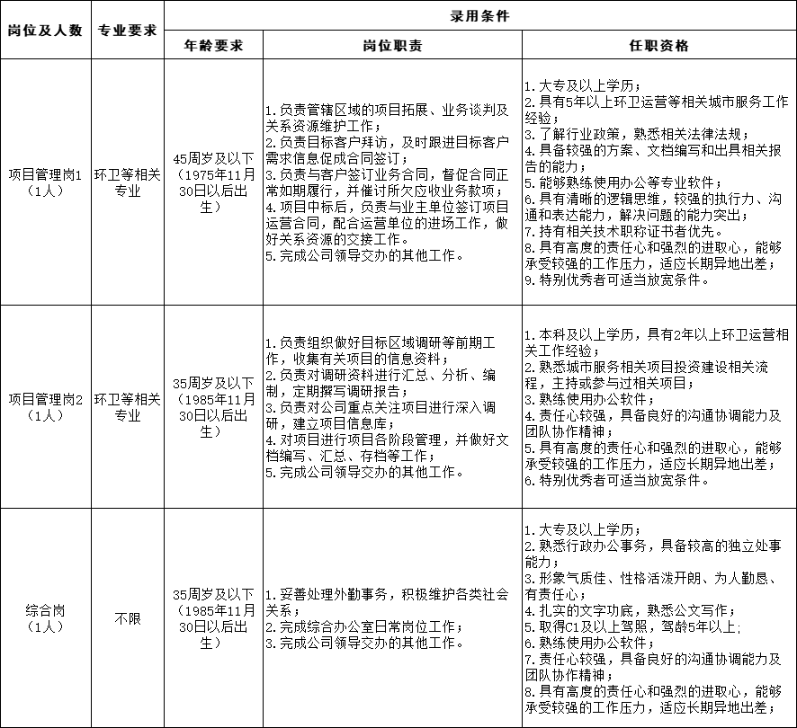 公司控股股东山西大地环境资源有限公司(以下简称“环资公司”)成立于2009年4月,注册资本3亿元,是山西省属重点骨干企业山西大地环境投资控股有限公司旗下专业从事工业固废资源化处置、建筑垃圾资源化利用、生活垃圾高效处置及环卫事业城乡一体化的全资子公司。股东清尘环保技术有限公司成立于2013年,注册资本1亿元,是河南省首家获得省辖市级城市生活垃圾清运作业权的专业化城市服务运营商,也是中原地区“城市垃圾直运”首倡者和践行者。目前,清尘环保服务区域已经覆盖河南、甘肃、贵州、陕西、山东、山西、青海、广东等省,运营的各种环卫、园林、照明等城市服务类项目数十个。因业务发展需要,现面向社会招聘工作人员3名。具体招聘公告如下:
