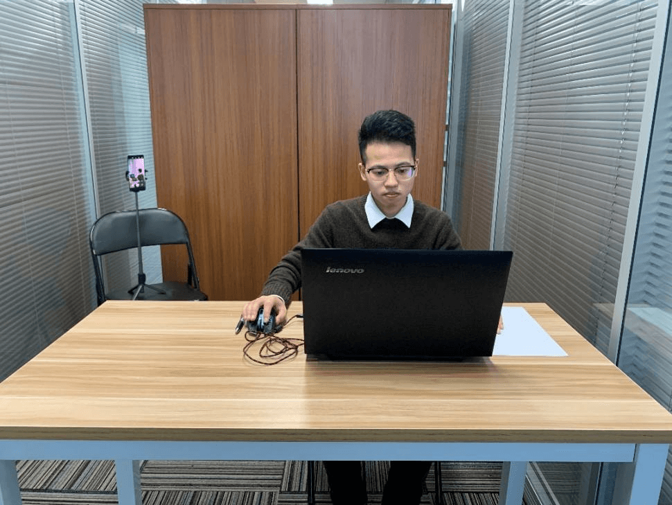 2、进入考试页面前,考生需要先登录移动端“智试通”,用前置摄像头360度环绕拍摄考试环境,随后将移动设备固定在能够拍摄到考生桌面、考生电脑桌面、周围环境及考生行为的位置上继续拍摄。