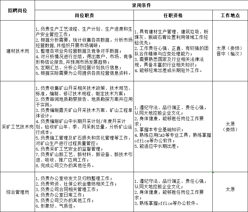 为适应山西大地中工环保科技有限公司(以下简称“大地中工”)全方位高质量发展的需要,根据实际工作需求,现面向社会公开招聘工作人员3名(其中建材技术岗1名,采矿工艺技术岗1名,综合管理岗1名),现就有关事项公告如下: