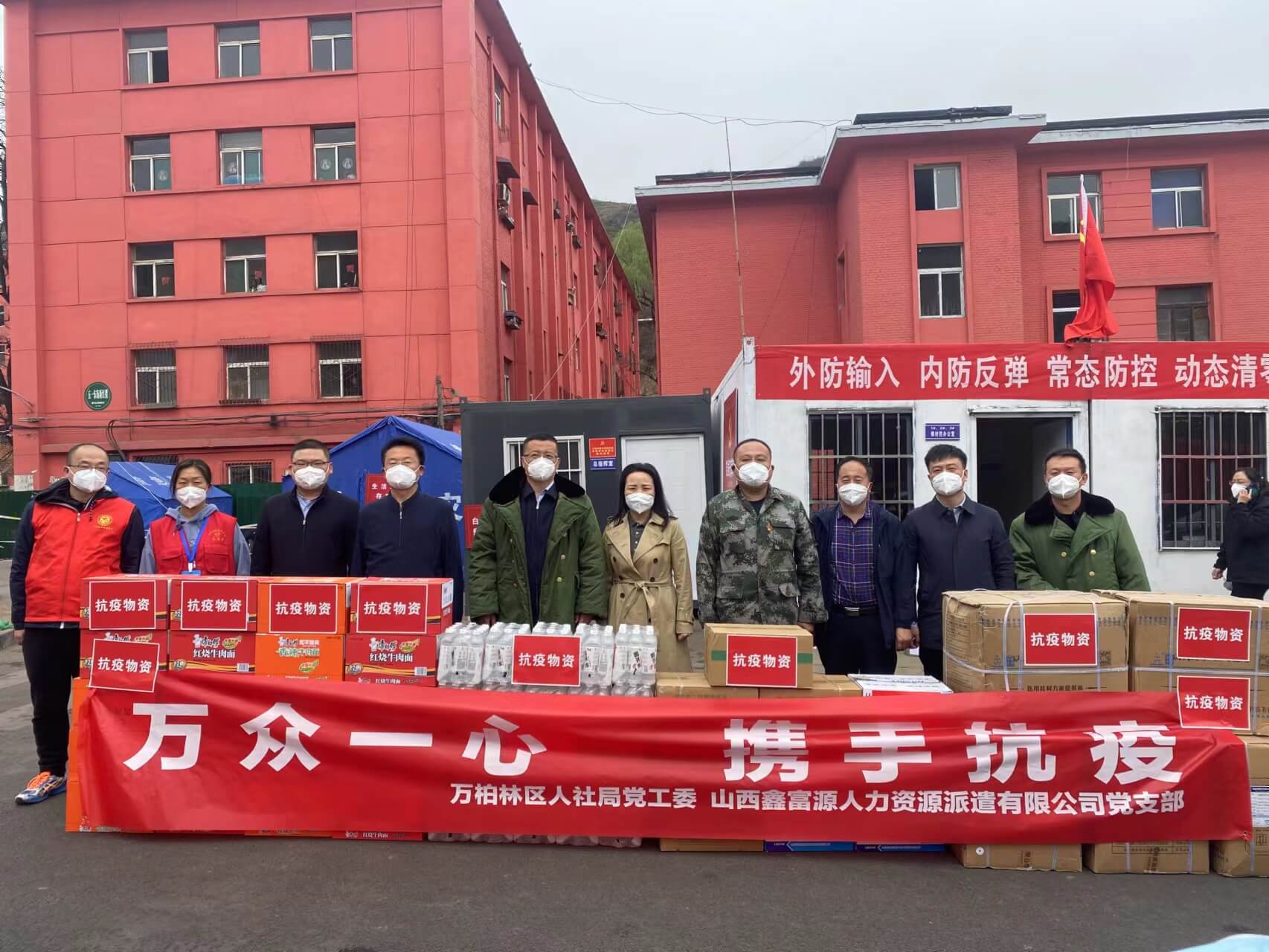 4月3日,突如其来的新冠疫情席卷龙城,来势汹汹的疫情一直牵动着我公司全体员工的心。疫情面前没有旁观者,为了践行社会责任,发挥企业担当,支持抗疫一线,我公司党支部联合万柏林区人社局党工委通过多种渠道紧急筹措到一批抗疫物资。4月14日上午,医用口罩、84消毒液、免洗手消毒液、方便面和矿泉水等物资送达白家庄街道疫情防控指挥部,相关领导及工作人员接受了捐赠,并将统一调配使用,第一时间发放给疫情防控一线的工作人员。同时我公司另一组工作人员将方便面和矿泉水送往省高院12368诉讼服务中心,以保证值班人员的基本生活。